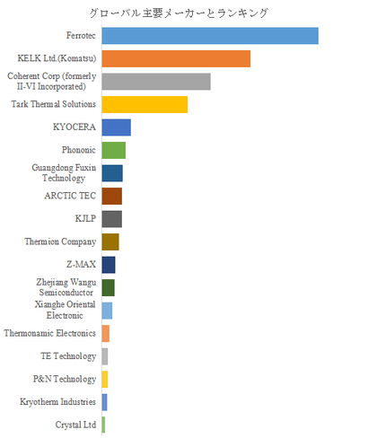現行の市場においては、日本のFerrotecおよびKELKが世界の技術標準をリードしている。両社は高信頼性モジュールと熱効率を両立させた製品開発を進め、半導体製造装置や光学機器、医療分析装置向けに幅広く展開している。これに続く米国のCoherent Corp(旧II-VI)、Tark Thermal Solutions、Phononicは、AIサーバーや光通信分野における温度安定化用途でプレゼンスを拡大している。一方、中国勢のGuangdong Fuxin TechnologyやZhejiang Wangu Semiconductor、Xianghe Oriental Electronicなどはコスト競争力を武器に、モジュール量産と車載用途への進出を強化している。さらに、TE TechnologyやKryotherm Industriesなど欧州・北米の中堅メーカーは、極低温・産業冷却用途で差別化を図る動きを見せる。今後の焦点は、材料技術の高度化と製造効率化であり、ビスマス・テルル系から新たな半導体合金、ナノ構造材料への移行が進むことで、性能向上とコスト削減の両立が期待されている。これにより、ペルチェ素子は「特定用途向け部品」から「システム統合型熱制御デバイス」へと進化していく段階に入ったといえる。