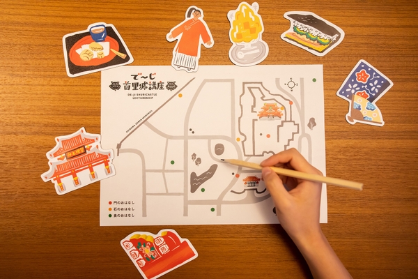 参加者全員にOMOオリジナルの「首里城周辺マップ」をお渡しします。講座で気になったポイントを記入することで、情報満載のオリジナルマップが完成。また講座の後半では「首里城クイズ」で楽しく復習します。首里城の魅力を楽しく学ぶことで、で~じ!首里城へ行きたくなること間違いなしです。