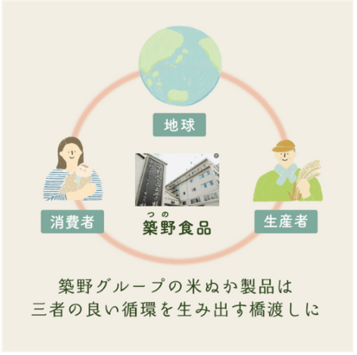 築野食品工業は長年、こめ油の原料である米ぬかの成分に着目し、研究を進めてまいりました。精米時に発生する副産物である米ぬかの成分を抽出することで、こめ油だけでなく食品、化学、医療、化粧品等の幅広い分野への高度有効利用をし、米ぬかの100%活用をしています。今後も国内の米ぬかを活用することで地球・生産者・消費者の良い循環の実現を目指していきたいと考えています。