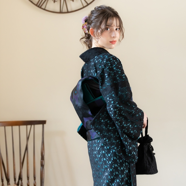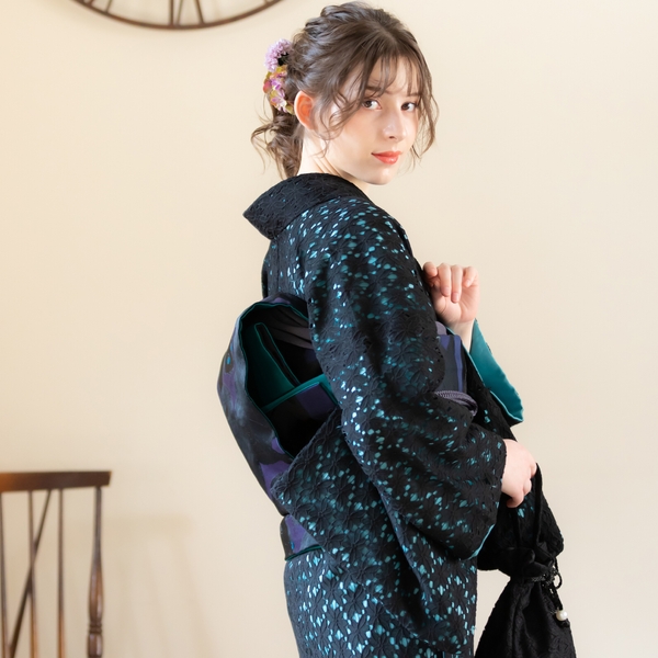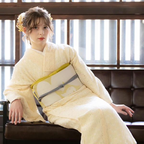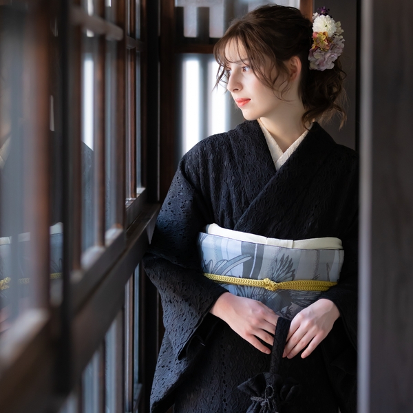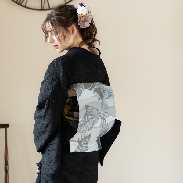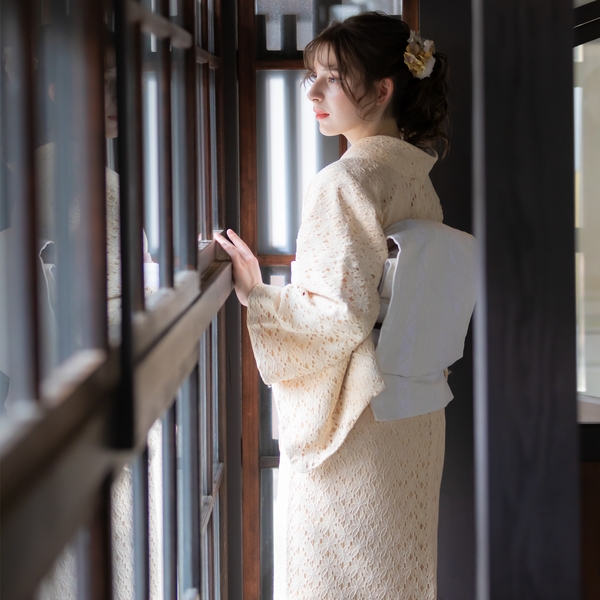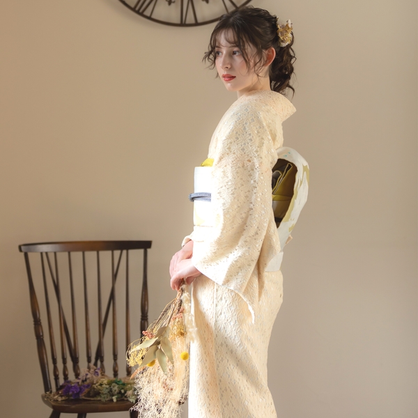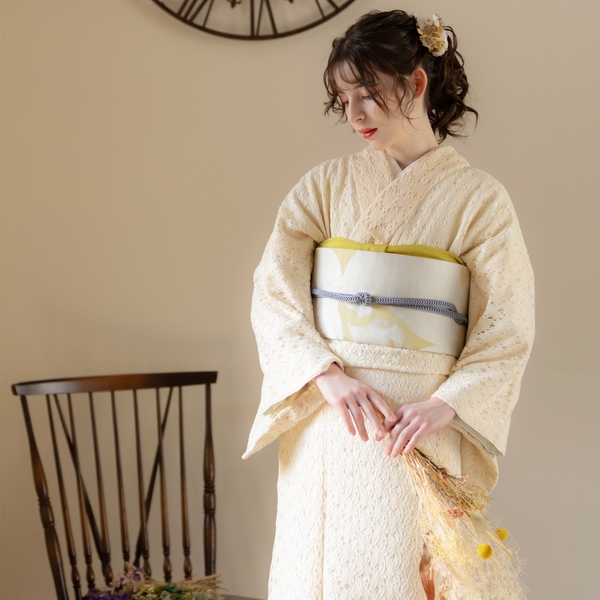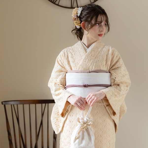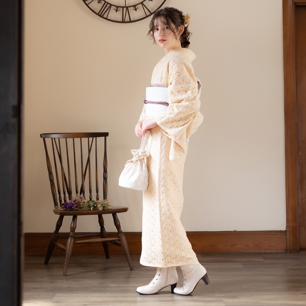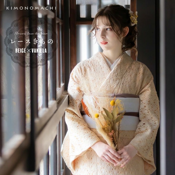 エレガントなフラワーレースに色裏地を重ねた配色。レースの陰影が魅力的だ。毎日のように着物を着る上級者にも、初めて着物を着るという初心者にも、もっと自由に、もっと気軽にきものを楽しんでほしいという思いから、ワンピース感覚で着られるレース着物をリリース。甘すぎないフラワーレースは、大人も十分楽しめるお洒落きものとなっている。