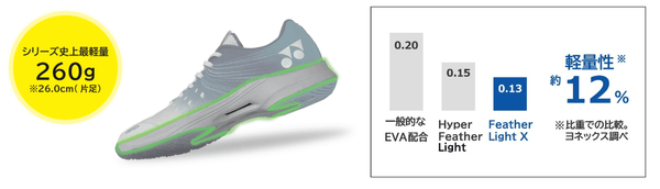 ミッドソール全体には、一般的なEVA材よりも約30%、従来の軽量素材ハイパー フェザーライト®よりも約12%軽い弊社史上最軽量素材「フェザーライト® X」を採用。また、中足部に搭載した立体成形の「3Dパワーカーボン」は、軽量のカーボン素材で剛性を保つことで部材を減らし、耐捻じれ性能を向上させつつ、軽量性がアップ。これらの新設計により、シリーズ史上最軽量を更新し、軽快なフットワークを生み出します。