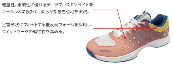 ※本商品は日本ソフトテニス連盟の使用基準に準拠しておりますが、中学生の各連盟主催大会ではまだカラーシューズの使用は認められていない場合もございますので各都道府県連盟にご確認ください。