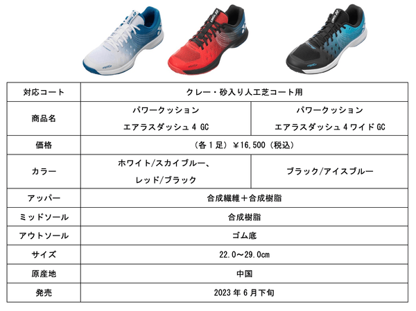 ヨネックス株式会社(代表取締役社長:アリサ ヨネヤマ)は、弊社独自の衝撃吸収性と反発性を合わせ持つ 「パワークッション®プラス」を搭載したシリーズ最軽量260g※1のクレー・砂入り人工芝コート用テニスシューズ「POWER CUSHION AERUSDASH 4(パワークッション エアラスダッシュ4)」を2023年6月下旬より発売いたします。