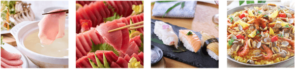 ◆天草ホテル亀屋:天草ならではの海鮮メニューをたっぷりご用意しました。天草産の鯛や鰤をはじめ、近海で獲れる新鮮な魚のお造りは舟盛でお楽しみください。ミネラルたっぷりの天草の塩で食べる「塩握り」、天草地方では<ガラカブ>と呼ばれるカサゴの唐揚げをお腹いっぱいお召し上がりください。