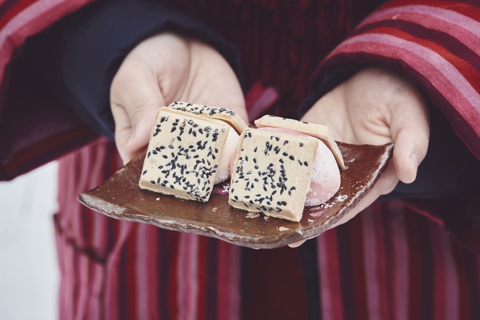 馬車に揺られ、体があたたまったところで提供されるのは、南部煎餅ではさみ、雪ん子がわらがさを被った形のアイス大福と、薪ストーブで香ばしく炙ったスルメです。あたたかい車内で雪景色を眺めながら冷たいおやつを食べ、ストーブでじっくり炙るスルメと薪の香りを楽しみ、冬を満喫できます。