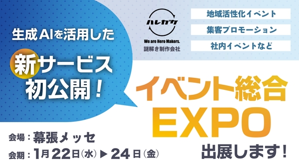 リアル謎解きゲームを使ったプロモーションを提案するイベント企画制作会社、株式会社ハレガケ(NAZO×NAZO劇団) (本社:東京都豊島区、代表:黒田洋介)は、2025年1月22日(水)から24日(金)にかけて幕張メッセにて開催される「第12回イベント総合EXPO」に出展いたします。