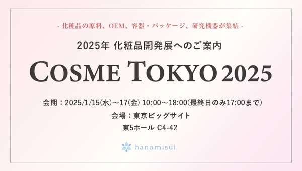 フェムケア商品を21年間研究開発している株式会社ハナミスイ(本社:東京都新宿区、代表取締役:方 智煥、以下「ハナミスイ」)は、2025年1月15日(水)~17日(金)に東京ビッグサイトで開催される「第15回化粧品開発展」に出展いたします。今回の展示では、ハナミスイの最新技術と製品を通じて、女性の健康課題に向き合う革新的なソリューションをご提案します。