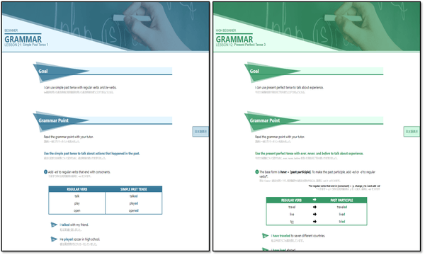 初級者・初中級者向けの文法教材です。基本的な英文法を学び直したい方、英文法を用いて会話ができるようになりたい方へおすすめです。各レベルにあわせた文法が教材では用意されており、本教材のレッスンでは、文法の使い方の確認に始まり、ドリル演習、そして英作文と、ステップを踏むごとに、実際の会話で使える状態へと少しずつ近づいていきます。本教材のレッスンでは、正しい文法の理解だけではなく、会話で実際に使えるようになることを目指します。