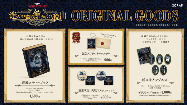 リアル脱出ゲームを企画運営する株式会社SCRAP(所在地:東京都渋谷区、代表者:加藤隆生)は、2023年10月29日(日)より「TOKYO MYSTERY CIRCUS(以下、東京ミステリーサーカス)」にて開催する新作リアル脱出ゲーム Escape from The NINE ROOMS『迷いの森の館からの脱出』のオリジナルグッズを公開いたします。【特設サイト: https://mysterycircus.jp/s/9magic/】