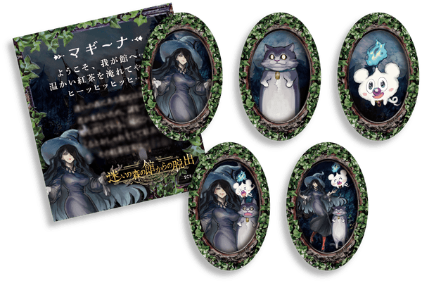本日初公開となるのが、『迷いの森の館からの脱出』限定のオリジナルグッズ4点です。その中でも注目なのが、本公演で参加者が迷いの森を訪れる前日譚が記された「謎解きティーブック」。霧の立ち込める迷いの森に魔女の館が浮かび上がるメインビジュアルの表紙が目印です。封入されたティーバッグで紅茶を味わい、謎と物語を楽しんだ後はお部屋に飾るのもおすすめです。また本公演の登場キャラクター、魔女マギーナや使い魔ノックス、妖精ぺスなどがデザインされた「館の住人マグネット」には、本編で知ることのできないちょっとしたエピソードも読めるおまけカードがセットになっています。さらにリアル脱出ゲームのオリジナルグッズに欠かせない「脱出成功/失敗ステッカー」や、脱出成功者だけしか購入できない、とある人物からの手紙が付いた特別な「記念アクリルキーホルダー」もご用意しております。