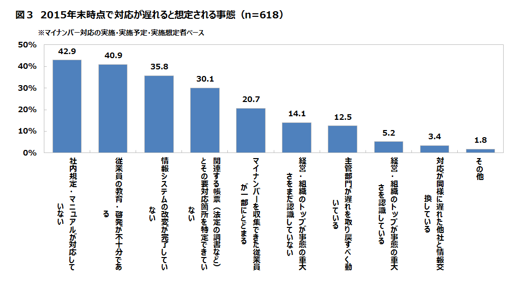 マイナンバー対応が求められる2015年末時点で、対応が遅れた場合に想定される事態を、マイナンバーの実施・実施予定・実施想定層に複数回答で尋ねたところ、全10項目のうち、「社内規定・マニュアルが対応していない」が42.9%、そして「従業員の教育・啓発が不十分である」が40.9%で、この2項目が4割台と高かった(図3)。