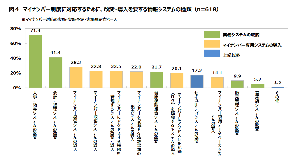 マイナンバーの実施・実施予定・実施想定層が、対応する必要があると考えている情報システム(複数回答)の筆頭は「人事・給与システムの改変」で71.4%、2位は「会計・経理システムの改変」で41.4%、3位は「マイナンバー保管システムの導入」で28.3%ある(図4)。4~8位の5項目はいずれも2割台前半でほぼ同じ水準にある。
