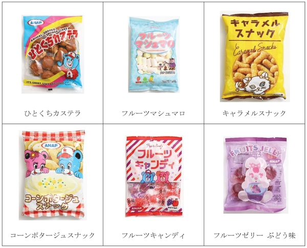 今回新たに発売するお菓子は全6種類。ANAP のポップでキュートなキャラクターデザインのパッケージで見た目は可愛くてカラフルですが、中身は保存料・合成着色料不使用でお子様にも安心・安全のお菓子です。誰もが親しみのある定番菓子で、幅広い世代の方々にお楽しみいただけます