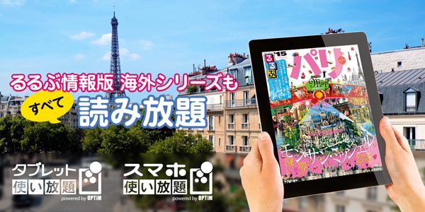 ビジネス向けスマートフォンアプリ・タブレットアプリのマーケットリーダーである株式会社オプティム(以下 オプティム)は、トータル電子雑誌サービス「タブレット使い放題・スマホ使い放題」で、日本全国47都道府県の「るるぶ情報版 国内シリーズ」、「るるぶ情報版 温泉&宿シリーズ」、「るるぶ情報版こどもとあそぼ シリーズ」を提供中の株式会社JTBパブリッシング(以下 JTBパブリッシング)と業務提携の拡大を行い、新たに「るるぶ情報版 海外シリーズ」64誌を2015年4月22日より追加いたします。これにより、日本全国のるるぶ情報版シリーズとあわせて合計124誌のるるぶが読み放題となり、「タブレット使い放題・スマホ使い放題」一つで世界中の魅力ある観光地やグルメ、レジャーをお楽しみいただくことができます。