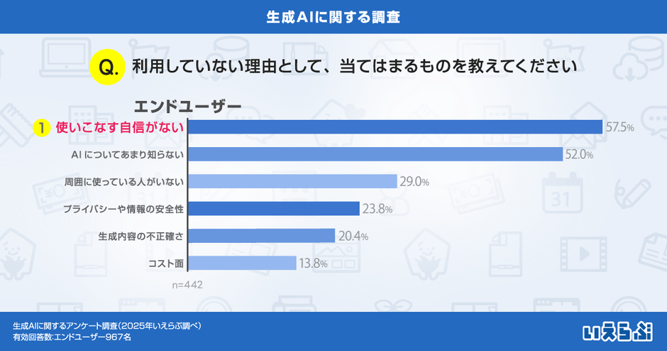 生成AIをまだ利用していないエンドユーザー(※3)にその理由を尋ねたところ、「使いこなす自信がない」が57.5%と圧倒的に多く、次いで「AIについてあまり知らない」(52.0%)という回答が続きました。