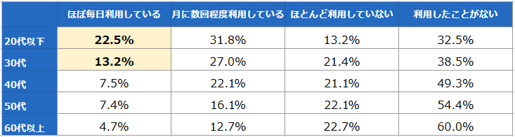 年代別に見ると、「ほぼ毎日利用している」と回答したのは、主に20代以下・30代に多く見られました。