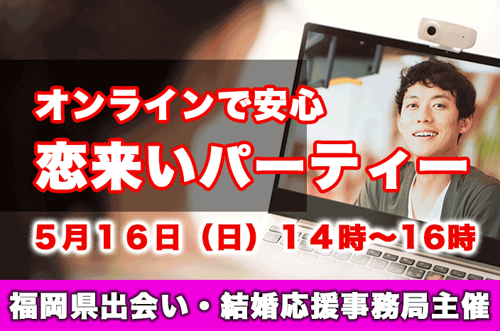 福岡県 出会い・結婚応援事務局では、5月16日(日)14時から、Zoom を使用してご自宅などから参加していただくオンラインパーティを開催いたします。 おつまみやデザート、飲み物などをご自分で用意してご参加ください。
