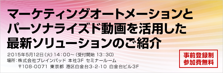 2015年4月20日 15:30 株式会社ブレインパッドは、『マーケティングオートメーションとパーソナライズド動画を活用した最新ソリューションのご紹介』というテーマで2015年5月12日(火)にセミナーを開催いたします。