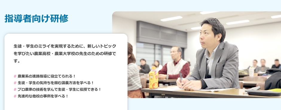 コンセプト:「農業に関わる仕事に就きたい!」という生徒の進路指導に携わる先生向けの研修です。「キャリア支援」という観点から、高い就農率を実現する農業高校の取り組み事例をご紹介するほか、農業インターンや海外研修等への高校生の参加事例も取り上げ、高校生が農業に関わるキャリアを歩む助けになる研修プログラム等を紹介します。そのほか、就農を目指す高校生を支援する際に、指導者が活用できるノウハウや情報の提供もおこないます。