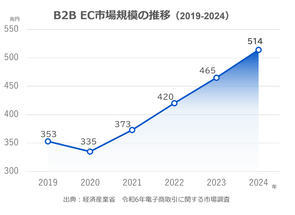 経済産業省の市場調査*1によると、日本のB2B EC市場規模は約514兆円に達し、B2C EC市場は約26兆円となり、B2B ECはB2C ECの約20倍の規模となっています。