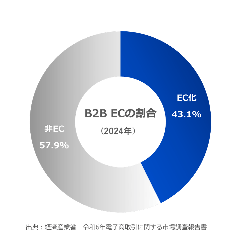 調査によると、B2B取引のEC化率(電子商取引化率)は43.1%*2とされています。これは、企業間取引の一定割合が電子化されていることを示していますが、見方を変えると約6割は依然としてEC化されていないとも言えます。