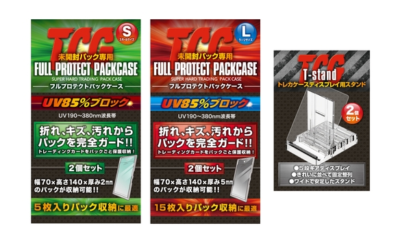 カード枚数は種類により異なるため、パックケースはスモールサイズ・ラージサイズの2種類展開。スモールサイズは5枚入りパック、ラージサイズは15枚パックまでを収納可能。