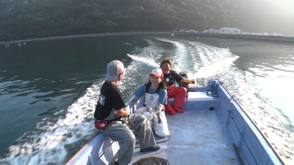 三重県熊野市の二木島(にぎしま)湾にある小さな港、甫母(ほぼ)漁港で漁をしているのが、漁師の仕事をはじめて4年のリーダー・田中りみさん、チームのムードメーカー・西地絵美さん、最年少の松村ありすさんの3人。全員が熊野市出身で、2年前から力を合わせて漁師をしています。