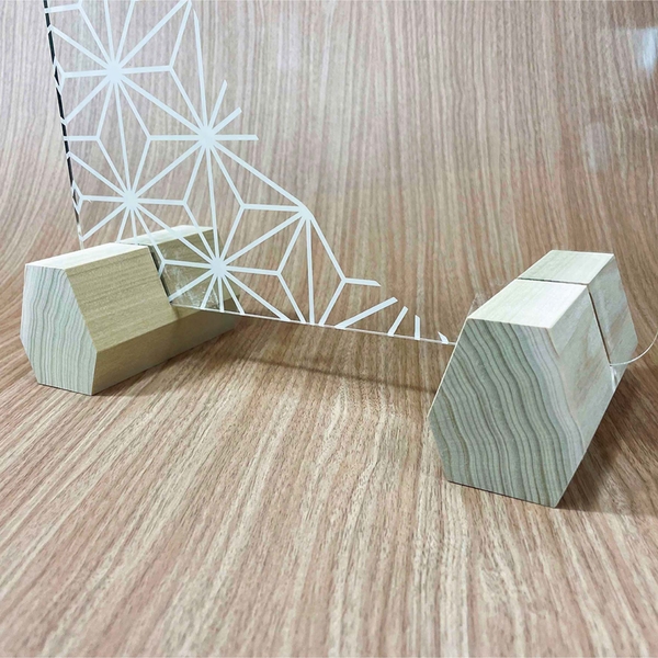あたりまえのような透明アクリルパーテーションに飽きてしまった方へ、今までにない和風柄デザインの木製足付きアクリルパーテーションを開発しました。
