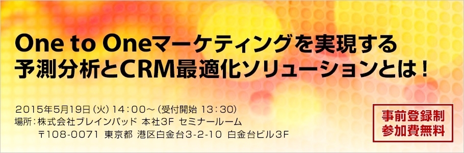 2015年4月23日 15:30 株式会社ブレインパッドは、『One to Oneマーケティングを実現する予測分析とCRM最適化ソリューションとは!』というテーマで2015年5月19日(火)にセミナーを開催いたします。