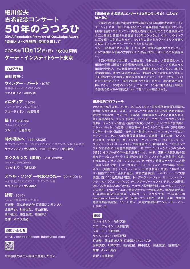 細川俊夫古希記念コンサート実行委員会主催、『細川俊夫 古希記念コンサート 50年のうつろひ』が2025年10月12日 (日)にゲーテ・インスティトゥート東京(東京都 港区 赤坂 7-5-56)にて開催されます。 チケットはカンフェティ(運営:ロングランプランニング株式会社、東京都新宿区、代表取締役:榑松 大剛)にて発売中です。
