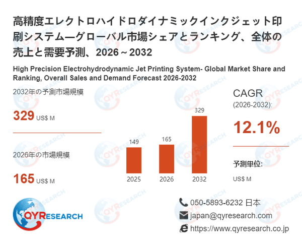 QYResearchが発表した新たな市場調査レポート「高精度エレクトロハイドロダイナミックインクジェット印刷システム―グローバル市場シェアとランキング、全体の売上と需要予測、2026~2032」によると、世界の高精度エレクトロハイドロダイナミックインクジェット印刷システム市場規模は2025年の約149百万米ドルから2026年の165百万米ドルへと順調に拡大すると見込まれ、予測期間中は年平均成長率(CAGR)12.1%で成長し、2032年には329百万米ドルに達すると予測されている。