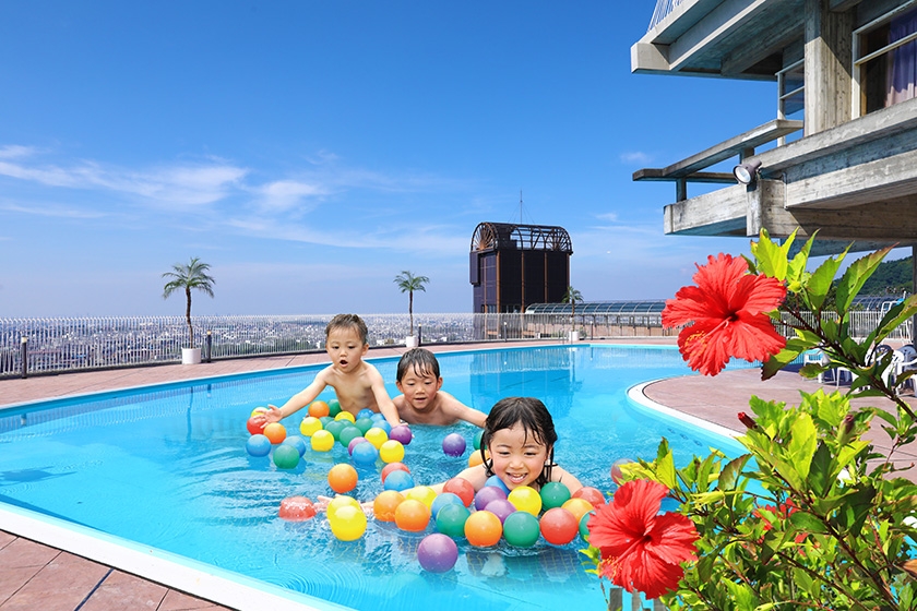 その魅力は何と言ってもプールサイドからの眺望。眼下に大阪平野のパノラマが広がり、遠く大阪湾まで眺めることができます。