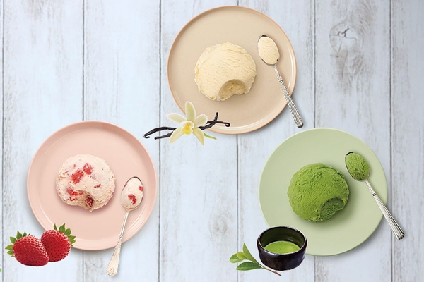 人気のバニラ、ストロベリー、グリーンティーの3つのフレーバーをきれいに盛り付けて、見た目も涼し気な、クールな美味しさを心ゆくまでお楽しみください。