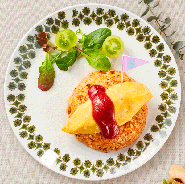 2 温めたオムレツを横半分にスライスし、盛り付けたごはんの上にのせる。