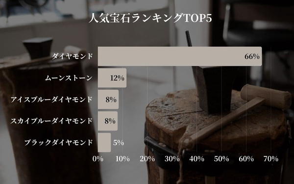 ご来店のお客様に選ばれている宝石として、最も人気が高いのは「ダイヤモンド」で、全体の66%を占めています。シンプルかつ特別感のある輝きが、記念のリングにふさわしいと好評です。また、ムーンストーンやカラーダイヤモンド(アイスブルー・スカイブルー・ブラック)など、個性や想いを込めた宝石を選ばれる方も増えており、多様なニーズにお応えできるラインナップへの関心の高さがうかがえます。