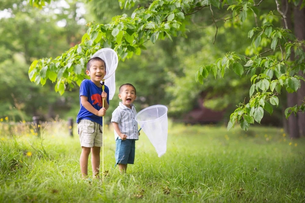 約22万坪の敷地内には、池や古民家の点在する公園があり、夏はセミやカブトムシなど様々な昆虫が集まります。昆虫の出没は、時間帯や場所により変わります。探検マップを持ち、公園を散策しながら研究するのがおすすめです。