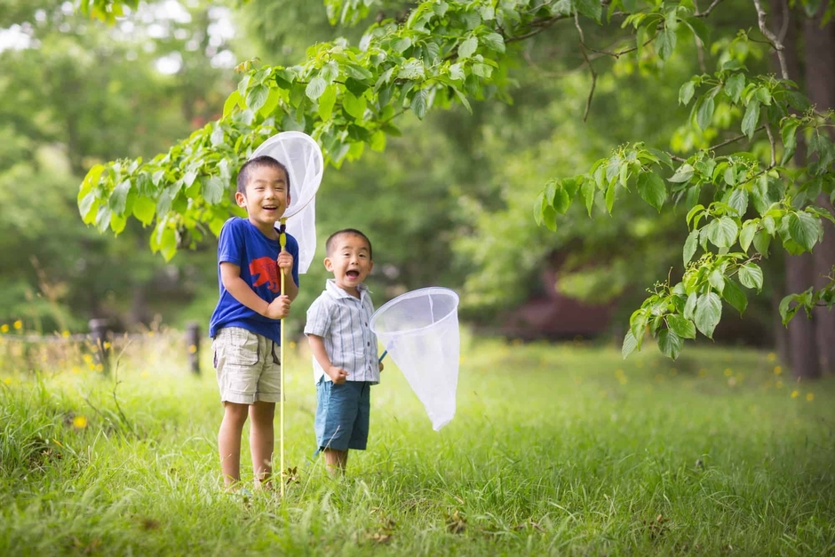 約22万坪の敷地内には、池や古民家の点在する公園があり、夏はセミやカブトムシなど様々な昆虫が集まります。昆虫の出没は、時間帯や場所により変わります。探検マップを持ち、公園を散策しながら研究するのがおすすめです。