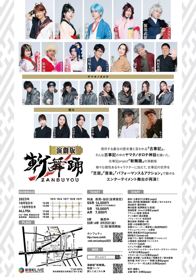 古事記project企画・製作、演劇版『斬舞踊』が2023年10月5日 (木) ~2023年10月9日 (月・祝)に新宿村LIVE(東京都新宿区北新宿2-1-2新宿村CENTRAL 地下2階)にて上演されます。この度、出演キャストと扮装ビジュアルが発表されました。