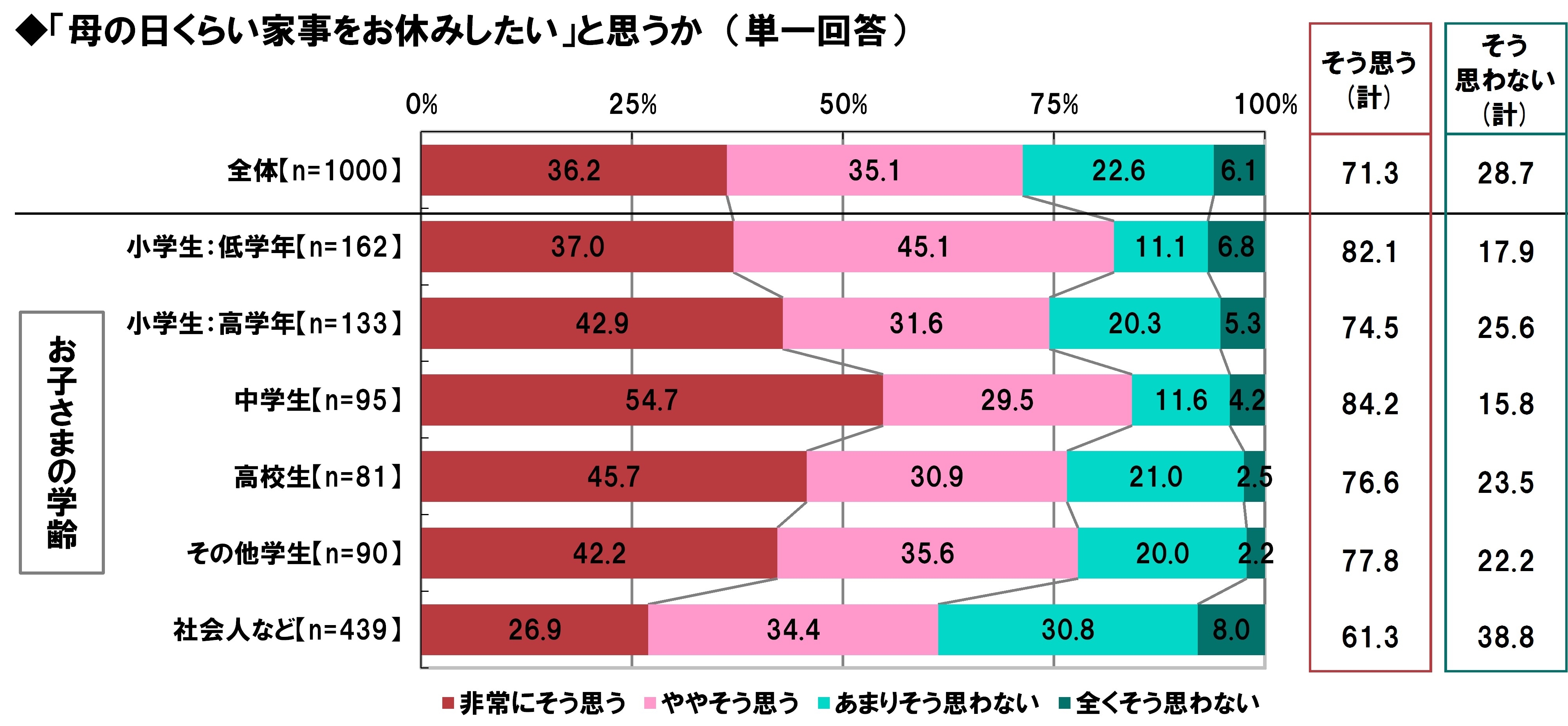また、お子さまの学齢別にみると、小学校低学年では『そう思う』が82.1%、中学生では84.2%と、他の学齢に比べて高めとなっています。子育てに手がかかる時期では特に、母の日に家事のお休みを欲しているようです。