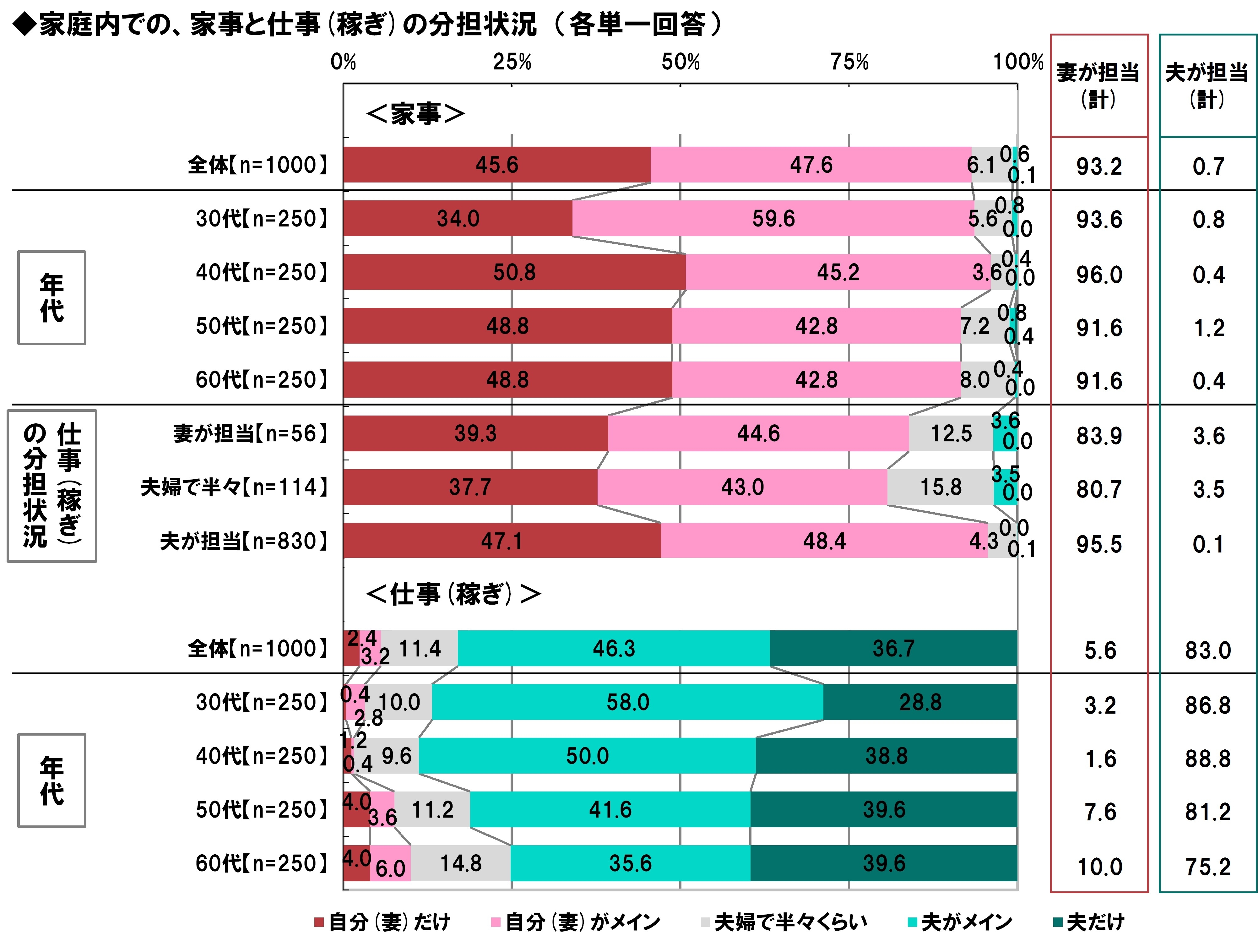 さらに、仕事(稼ぎ)の分担状況別に家事の分担状況を比較すると、仕事(稼ぎ)を妻が担当している家庭では、家事も『妻が担当』が8割半(83.9%)、仕事(稼ぎ)が夫婦で半々くらいの家庭では、家事は『妻が担当』が8割(80.7%)となっています。仕事(稼ぎ)の分担状況にかかわらず、女性が家事を担当する家庭が多いようで、家庭内の家事の分業が進んでいない状況が窺えました。