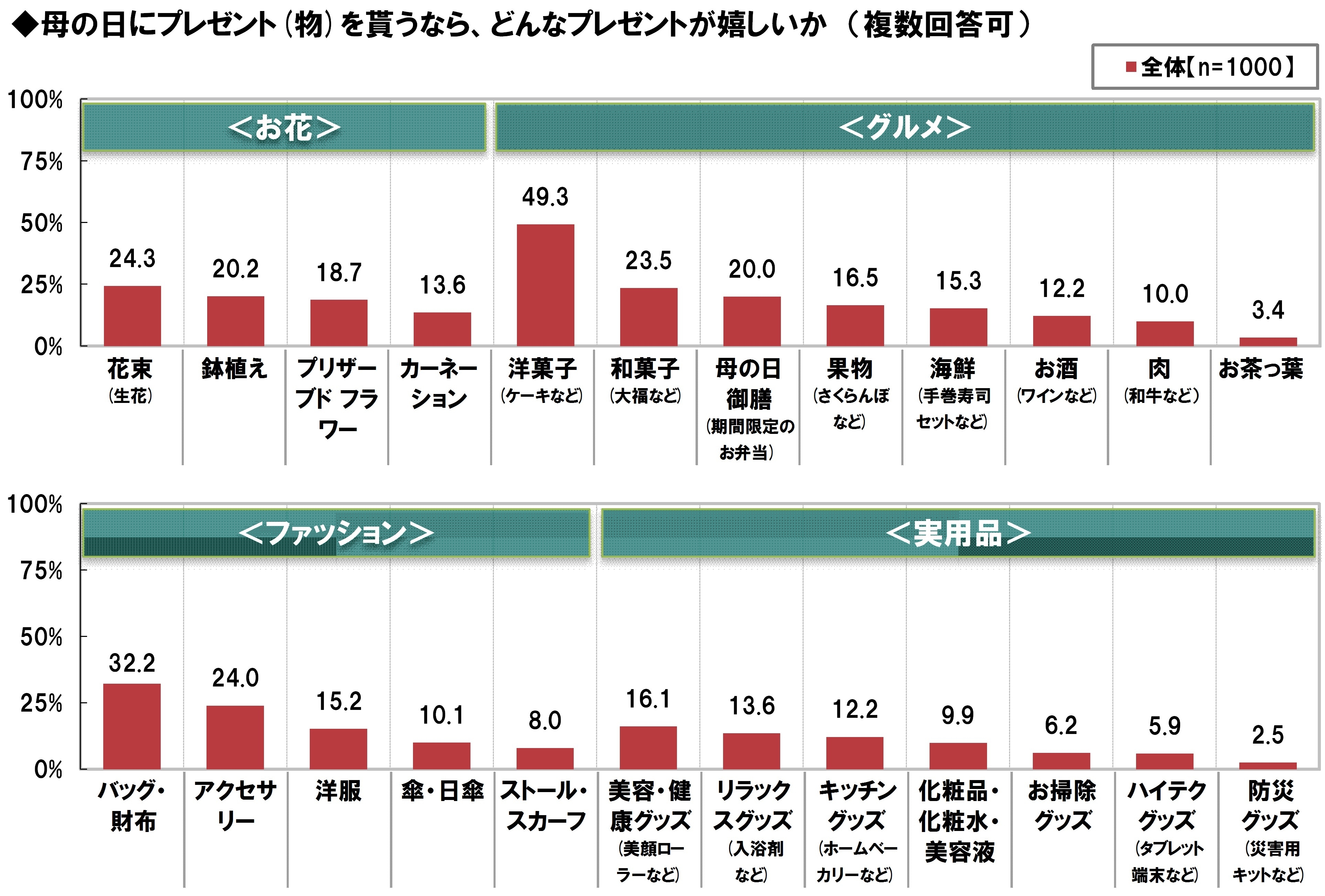 そのほか、<ファッション>部門の「バッグ・財布」(32.2%)や「アクセサリー」(24.0%)、<実用品>部門の「美容・健康グッズ(美顔ローラーなど)」(16.1%)など、おしゃれや美容・健康関連のプレゼントもお母さんから好評であることが窺えました。