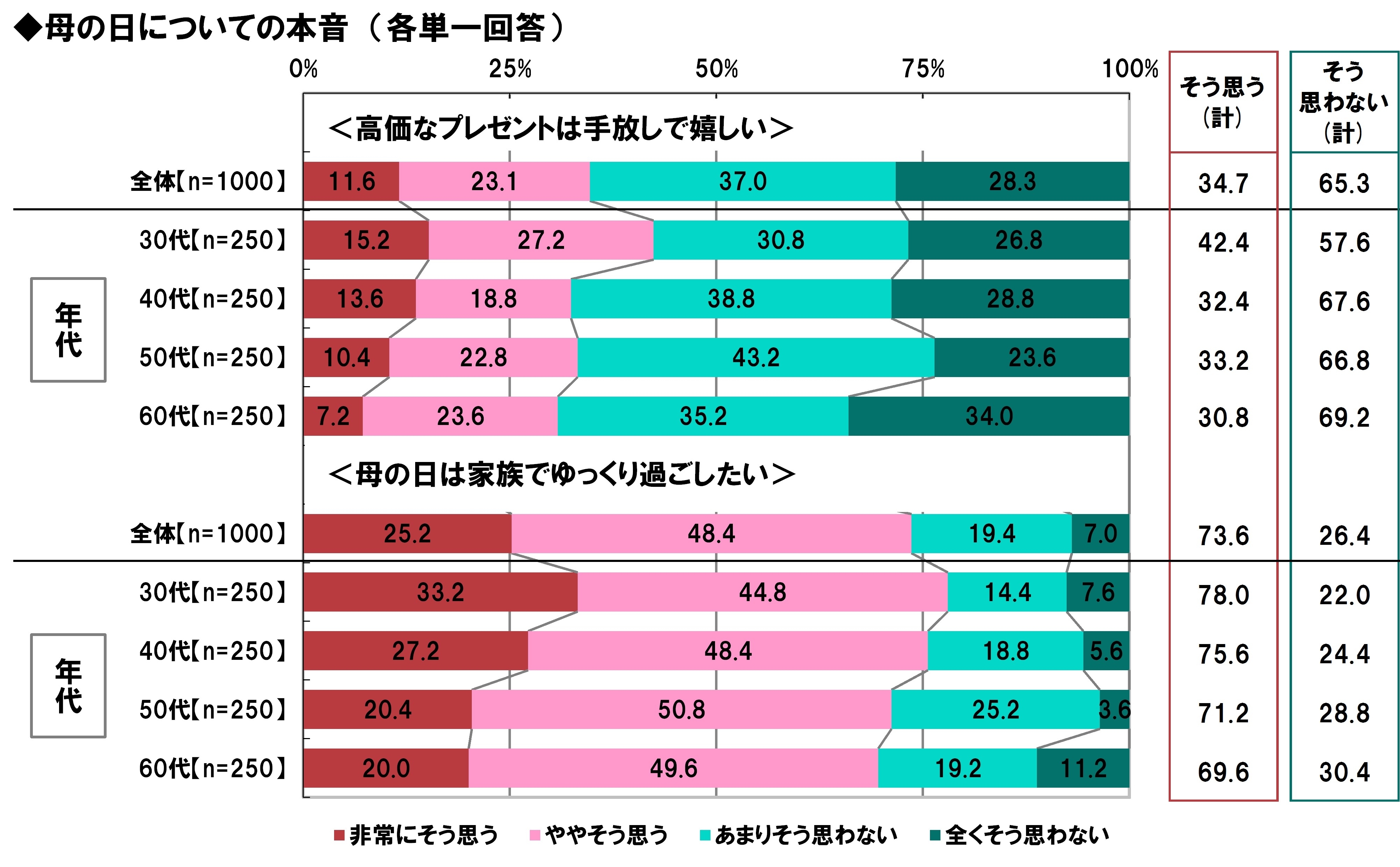 また、母の日についての本音を聞いたところ、「高価なプレゼントは手放しで嬉しい」では、『そう思う』が34.7%、『そう思わない』(「全く」+「あまり」)が65.3%となりました。他方で、「母の日は家族でゆっくり過ごしたい」では『そう思う』が73.6%と多数派となっています。高価なプレゼントよりも、家族揃ってゆっくりした時間を過ごせるように心配りをすることが、お母さんが喜ぶ母の日となるようです。