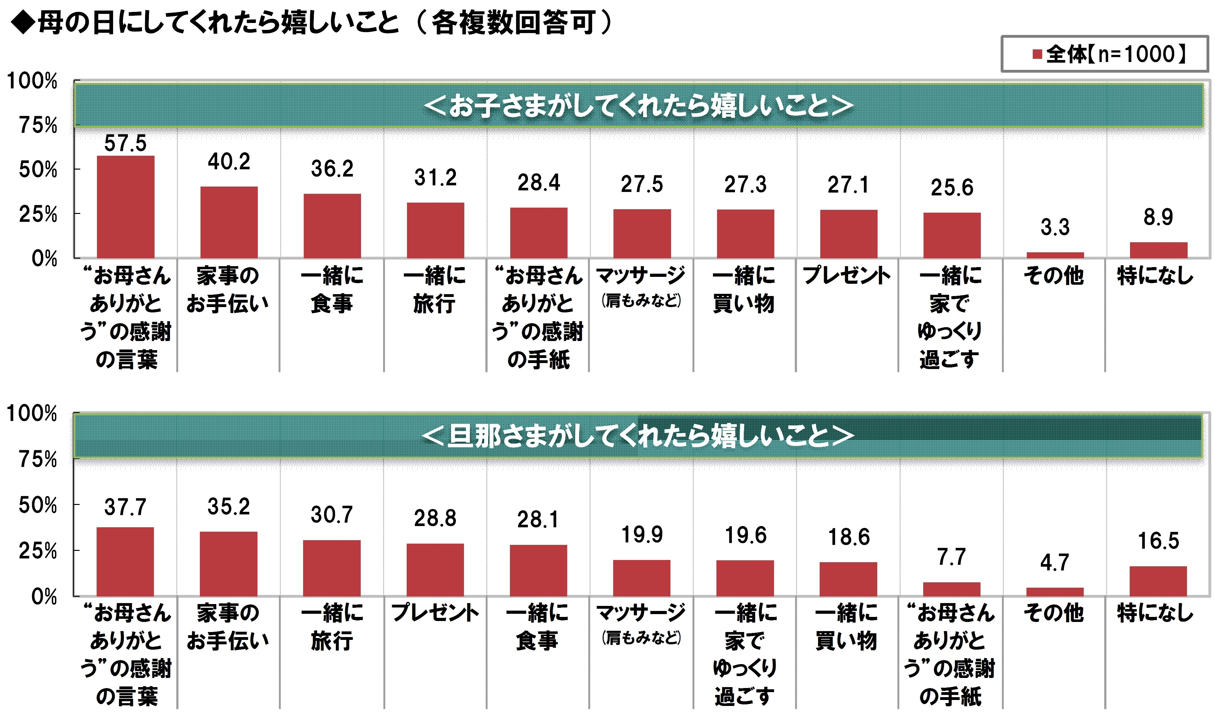 また、母の日に旦那さまがしてくれたら嬉しいことは何かについても聞いたところ、こちらも「“お母さんありがとう”の感謝の言葉」が37.7%で最も高く、「家事のお手伝い」が35.2%で続きました。母の日を機会に、普段しない家事を旦那さまが担当してあげたり、普段口にしない“ありがとう”を伝えることで、日頃の感謝の気持ちを表してみてはいかがでしょうか。