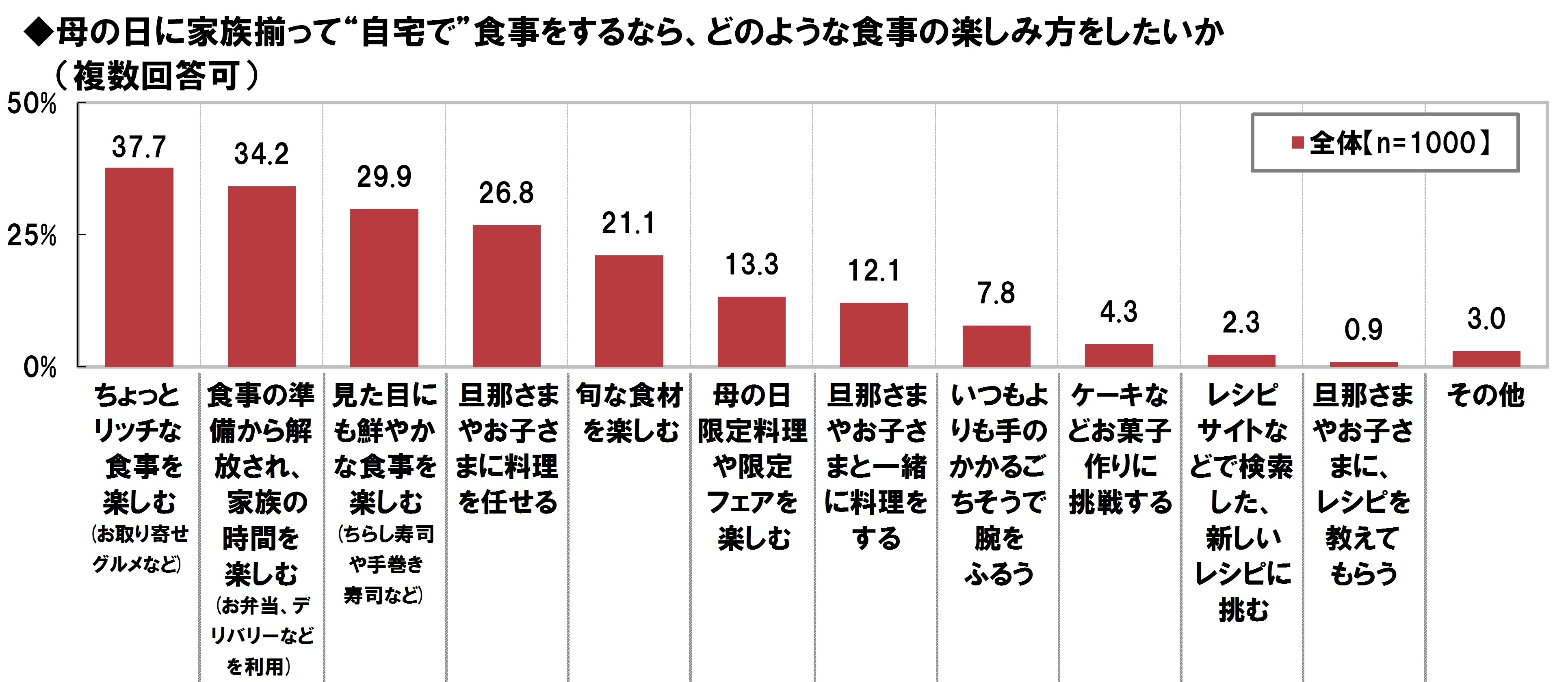 母の日には家事をお休みしたい、家族揃ってゆっくりした時間を過ごしたいと思っている母親が多数派でした。そこで、全回答者(1,000名)に対し、母の日に家族揃って“自宅で”食事をするなら、どのような食事の楽しみ方をしたいかを聞いたところ(複数回答可)、「ちょっとリッチな食事を楽しむ(お取り寄せグルメなど)」が37.7%で最も高く、「食事の準備から解放され、家族の時間を楽しむ(お弁当、デリバリーなどを利用)」が34.2%、「見た目にも鮮やかな食事を楽しむ(ちらし寿司や手巻き寿司など)」が29.9%で続きました。一方で「いつもよりも手のかかるごちそうで腕をふるう」は1割以下(7.8%)でそこまで人気が高くありませんでした。家事をお休みして家族揃ってゆっくりした時間を過ごしたいとのニーズにもマッチした、少しリッチで見た目にも鮮やかな“中食”が人気なのではないでしょうか。