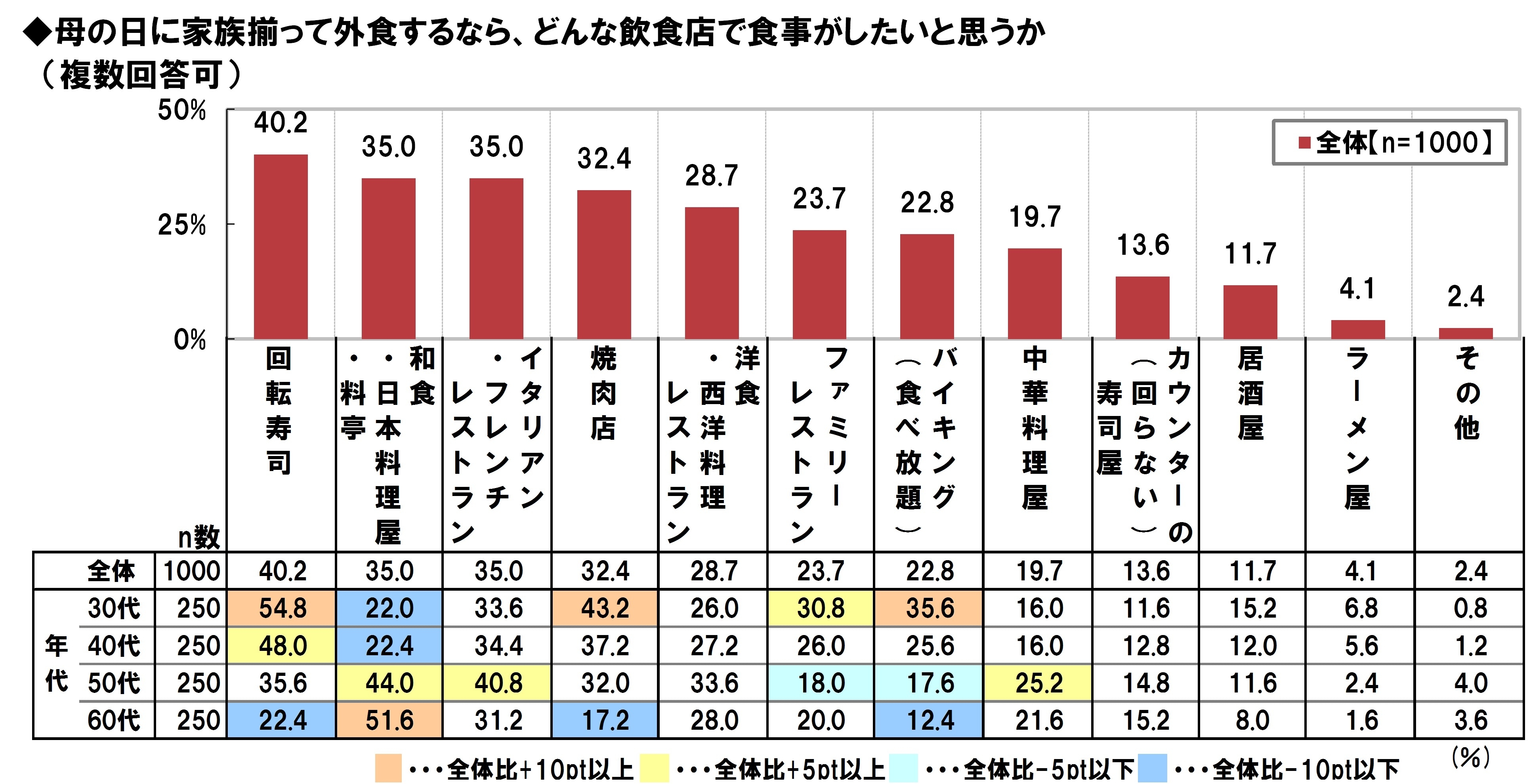では、母の日に外食するならば、どんな飲食店が選ばれるのでしょうか。母の日に家族揃って外食するなら、どんな飲食店で食事がしたいと思うか聞いたところ(複数回答可)、「回転寿司」が40.2%で最も高く、次いで「和食・日本料理屋・料亭」と「イタリアン・フレンチレストラン」が35.0%、「焼肉店」が32.4%で続きました。