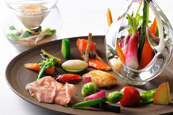 那須の恵みをふんだんに盛り込んだ一皿「農園のピンツィモーニオ」。那須の陶芸作家、小野澤弘一(おのざわこういち)氏が焼き上げた黒皿には、当リゾートの農園「アグリガーデン」で採れた野菜に加えて、那須で生産が多いチーズやヤシオマスが並べられ一目で恵みを感じます。スティック野菜は手でつまみ、収穫しているような感覚で食べられる一皿です。みずみずしい野菜をバーニャフレッダと組み合わせて楽しみます。