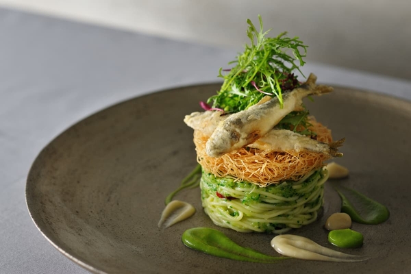 関東随一の清流、那珂川が流れる栃木県にちなみ、旬の川魚「稚鮎」を使用したパスタを提供します。繊細な口当たりが特徴のパスタ・フェデリーニに、夏らしい胡瓜のソースを絡めて提供。加えて、胡瓜とジェノベーゼのソース、鮎の塩辛「うるか」を使用したソースとも合わせて楽しみます。上には、サクサクとした食感のカダイフとフリットした稚鮎を添えており、さまざまな食感を同時に楽しむことができる一品です。
