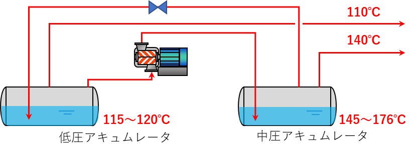 低圧アキュムレータと中圧アキュムレータを蒸気圧縮機で連結することにより、直列に配置しています。低圧蒸気がより有効に使用できるように中圧アキュムレータから低圧アキュムレータへ蒸気を送れるラインを設けています。