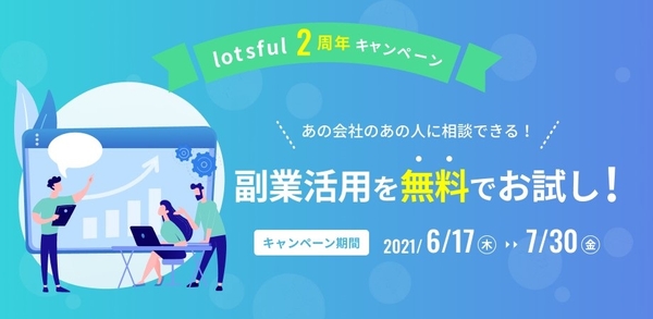 総合人材サービス、パーソルグループのパーソルイノベーション株式会社(本社:東京都港区、代表取締役社長:長井 利仁)が運営する副業人材マッチングサービス「lotsful(ロッツフル)」(https://lotsful.jp/)は、サービスリリース2周年を記念して、2021年6月17日(木)から7月30日(金)まで、新規でご登録いただいた企業(20社限定)を対象に、副業人材とのディスカッションを無料で体験できる「副業活用を無料でお試し!あの会社のあの人に相談できる」キャンペーンを実施いたします。対象企業は、「lotsful」のデータベースから社名や経歴、得意分野などを元に副業人材を指名することができます。