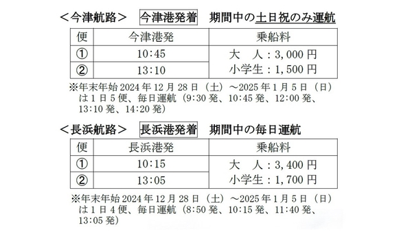 琵琶湖汽船株式会社(本社:滋賀県大津市浜大津、社長:川添 智史)では、12月2日(月)より、冬期ダイヤにて運航を開始いたします。